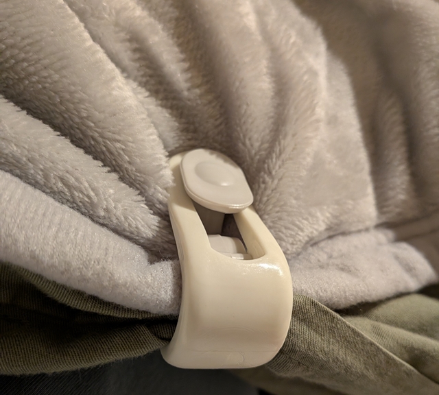 ひとつは、足元のクリップを留める時に、少しだけ毛布側にゆとりを持たせることだ。パツパツに張ってしまうと、寝返りの時に足の動きが制限されて窮屈に感じることがある。少し余裕を持たせて留めることで、動きやすさとズレ防止を両立できる。