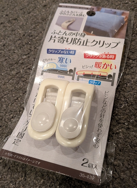 何とかしてこの2枚を一体化できないか。そう考えていた時に、100均のキャン★ドゥで見つけたのが「ふとんの中身片寄り防止クリップ2個入り」だ。