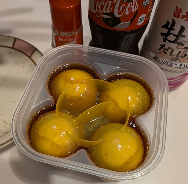 翌朝、蓋を開けてみると、卵が綺麗な琥珀色に染まっていました。食べてみると、コーラの甘みが醤油の角を丸くしていて、後から一味のピリッとした刺激が追いかけてきます。想像以上に本格的な「中華風あま辛味玉」になっていて驚きました。これなら、わざわざ八角などのスパイスを買い揃えなくても、手軽に複雑な味を楽しむことができます。