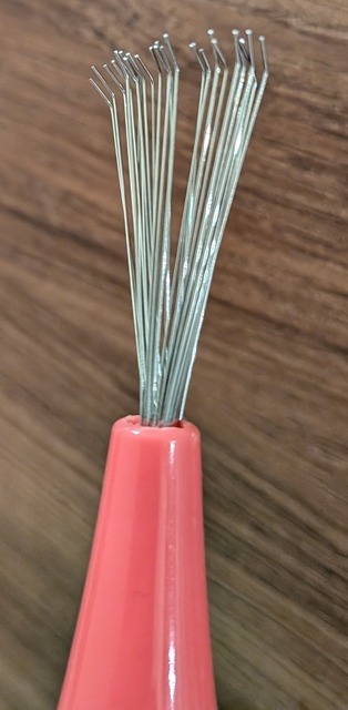 ダイソーのヘアブラシクリーナーは、見た目が小さな熊手のような形をしています。先端が硬い櫛状になっていて、これがブラシの毛の隙間にしっかり入り込む設計です。