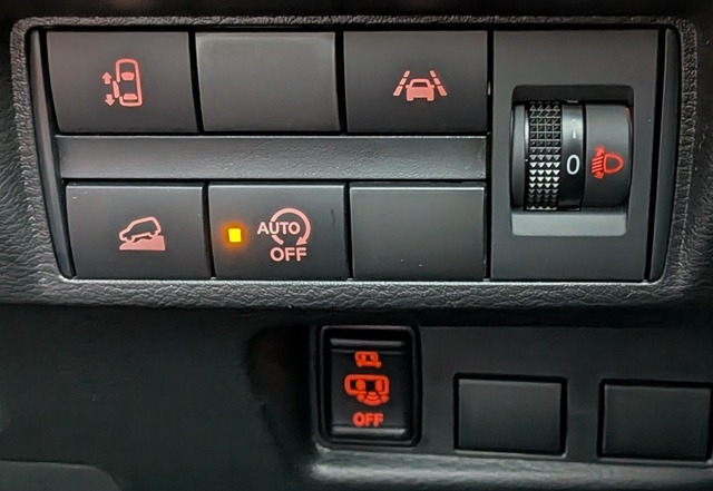 さらに、車がぶつかりそうになっているイラストに「OFF」と書かれたボタンもあります。これは衝突被害軽減ブレーキ(自動ブレーキ)の停止スイッチです。安全に関わる機能ですので、基本的には常にONの状態(消灯状態)で運転することをおすすめします。