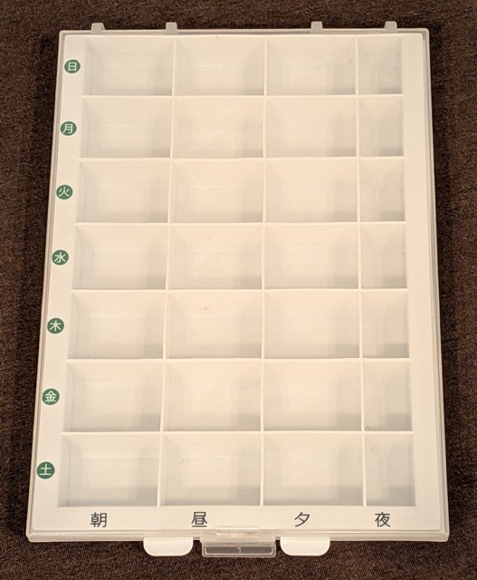 まず導入したのが、1週間分の薬を小分けにできる専用ケースです。月曜日から日曜日まで、さらに朝・昼・夕・夜と細かく仕切られているタイプを選びました。